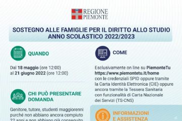 LA REGIONE PIEMONTE HA APERTO LE DOMANDE PER IL SOSTEGNO ALLE FAMIGLIE PER IL DIRITTO ALLO STUDIO. DAL 18 MAGGIO AL 21 GIUGNO 2022, LE...